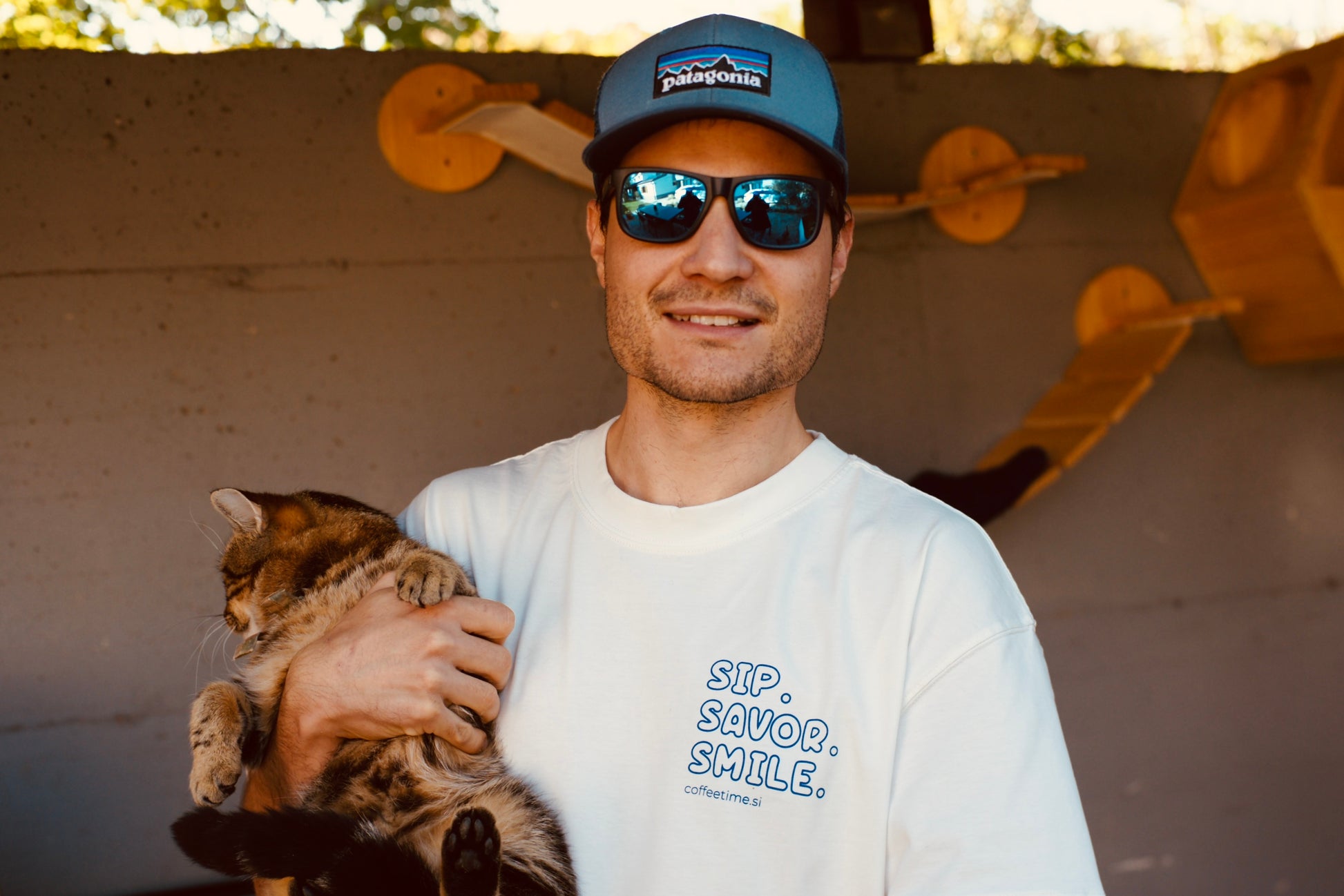 Auf der Vorderseite begrüßt dich „Sip. Savor. Smile.“, auf der Rückseite dein perfekter Moment der Ruhe: Hund, Buch und eine Maschine, deren Geräusch schon verrät, dass der Tag gut wird.