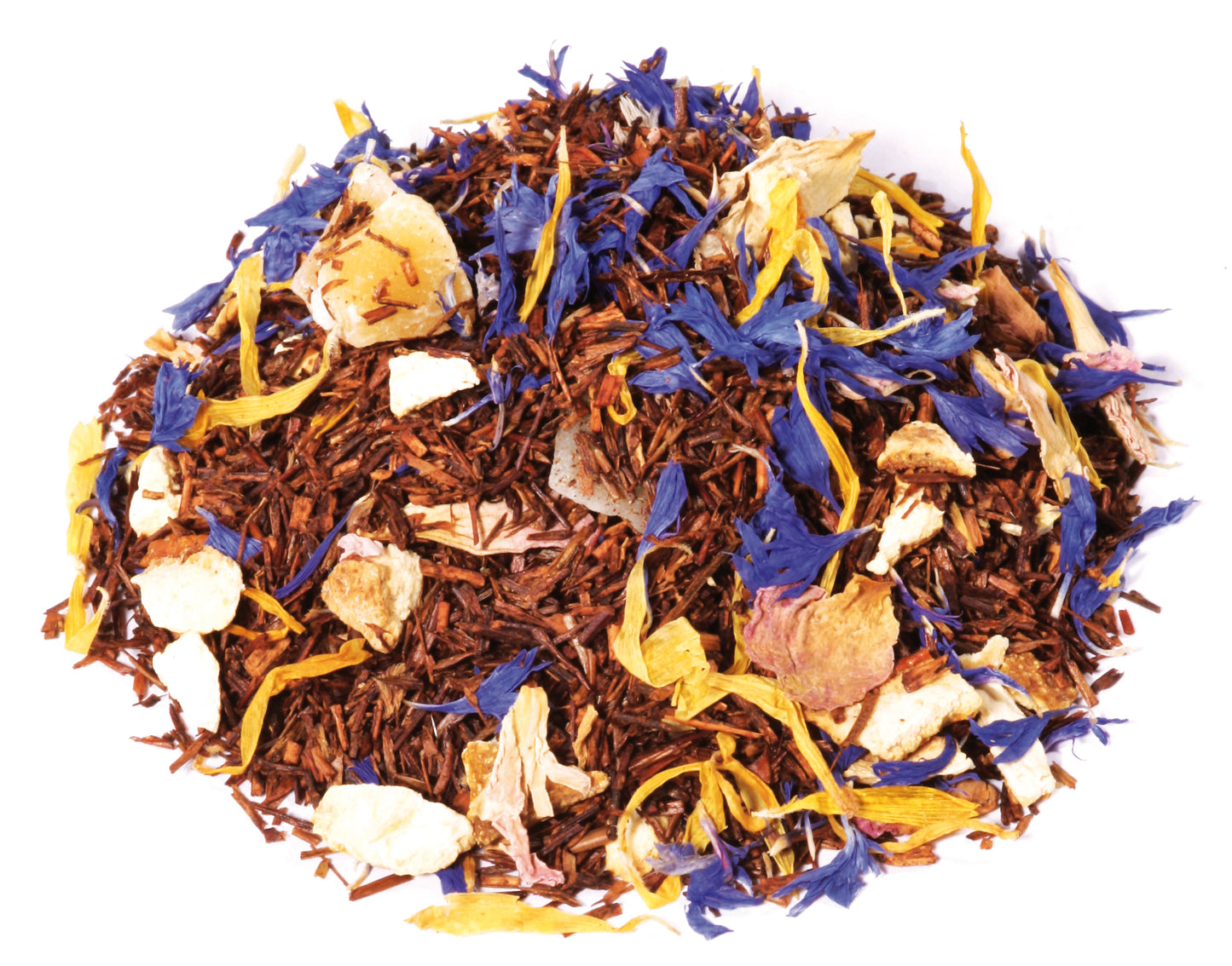 Natural rooibos, natural flavors, velvet, mango pieces, orange peel, rose flowers, apricot, blue cap.